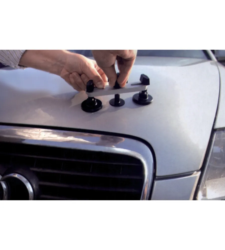Il kit rimuoverà le ammaccature fino alla dimensione di circa 20 cm. Basterà applicare al centro dell’ammaccatura un po’ di colla tramite l’apposita pistola in dotazione. Un perno andrà fissato proprio in questo punto e l’intera struttura a ponte andrà poi posizionata sopra. Basterà girare una piccola vite che tirerà piano piano il perno facendo fuoriuscire la carrozzeria. A gioco fatto la colla potrà essere tolta con gli appositi supporti e agenti in dotazione.