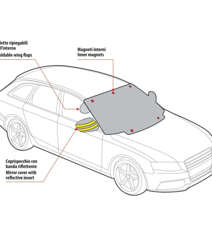 - I magneti consentono una rapida applicazione, evitando l’uso dei tergicristalli per tenere fermo il telo. In questo modo anche le spazzole tergicristallo vengono riparate e protette dagli agenti atmosferici.