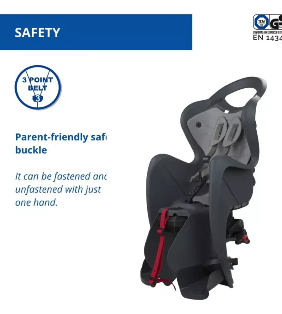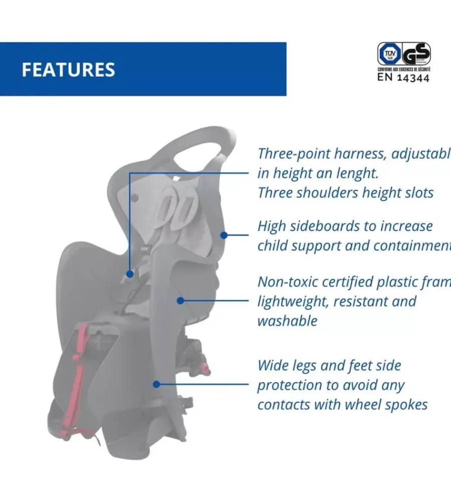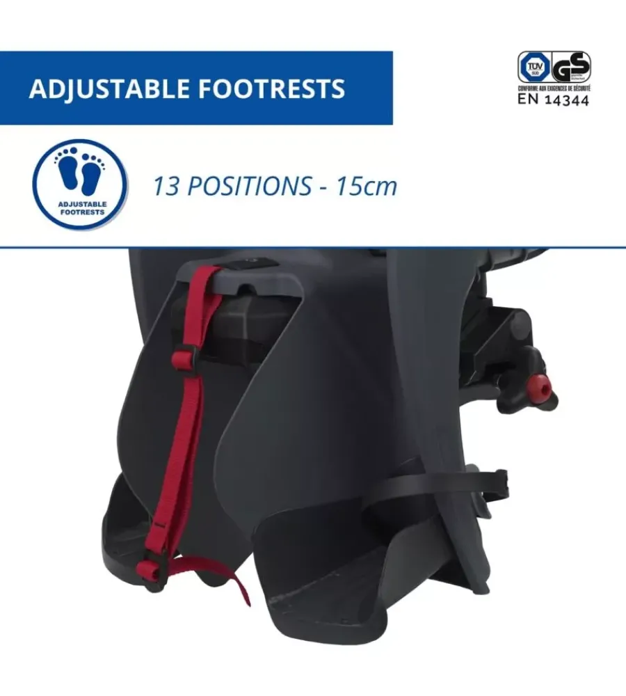 Realizzato con materiali atossici, presenta una struttura leggera ma resistente. La plastica utilizzata è facile da pulire, garantendo una manutenzione semplice e veloce per i genitori. Un altro vantaggio di questo seggiolino è la regolazione continua dell’altezza dei poggiapiedi, che può essere adattata in 13 diverse posizioni per una regolazione totale di 15 cm. Questo permette di adattare il seggiolino alla crescita del bambino, assicurando sempre una seduta comoda e sicura. Infine, per il massimo comfort del bambino, lo schienale ha un’angolazione ergonomica che sostiene meglio il collo, con uno spazio dedicato all’alloggiamento del caschetto. Questa attenzione ai dettagli garantisce un’esperienza di viaggio confortevole sia per il piccolo passeggero che per il ciclista.