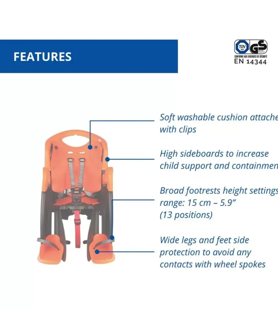 Il seggiolino è realizzato con materiali di alta qualità, inclusi un soffice cuscino lavabile fissato con clip per una facile pulizia. La regolazione è molto versatile: l’altezza dei piedini può essere adattata in 13 posizioni diverse, con una regolazione totale di 15 cm. Per garantire il massimo comfort, lo schienale del seggiolino è facilmente regolabile in altezza tramite una pratica manopola situata sul retro. È anche progettato con un alloggiamento per il caschetto, che aiuta a sostenere meglio il collo del bambino. Il fibbione di sicurezza è estremamente comodo per i genitori, poiché può essere agganciato e sganciato con una sola mano e regolato in profondità per adattarsi perfettamente.